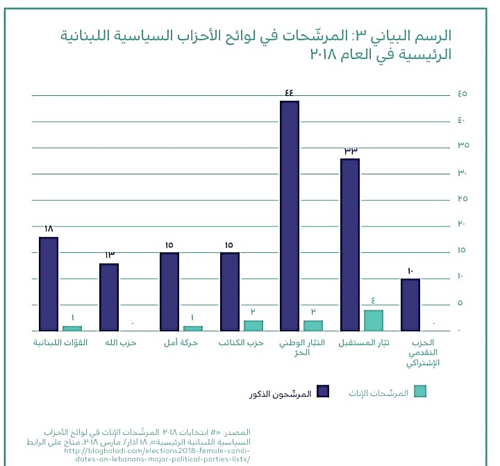 فقد قيّد نظام اللوائح بوضوح النساء في هذه الانتخابات (2018)، حيث لم يستطع 34% من المرشّحات الانضمام إلى لائحة! كما يجب على الأحزاب التقليديّة أن تقوم بخطوات فاعلة لتشجيع المشاركة الرسميّة، والفعليّة للنساء في ميدان السياسة.